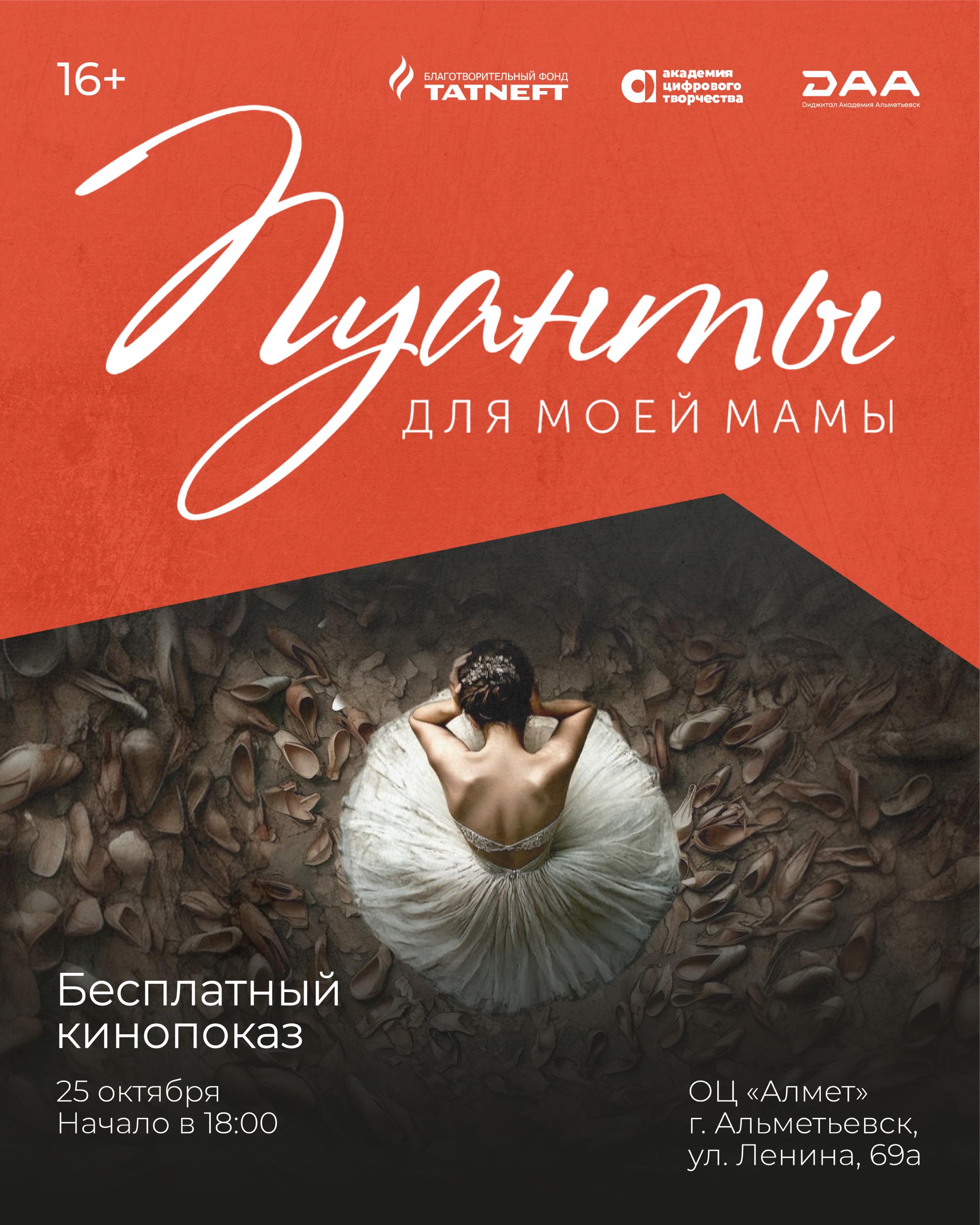 25 октября в 18:00 в ОЦ «Алмет» (ул. Ленина, 69а) состоится показ фильма «Пуанты для моей мамы» (16+) и встреча с режиссёром и продюсером картины Яной Недзвецкой.