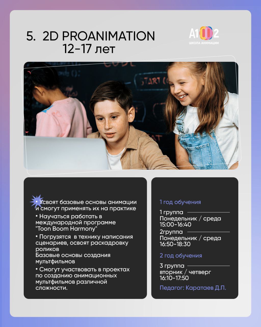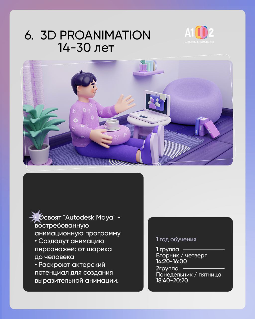 Обучение подходит как новичкам, так и тем, кто уже мечтает о карьере в сфере анимации.