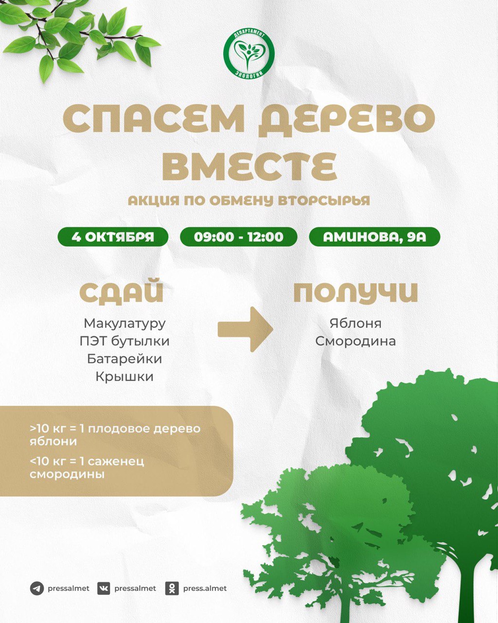 4 октября с 9:00 до 12:00 МБУ «Департамент экологии и благоустройства» приглашает жителей города принять участие в экологической акции «Спасём дерево вместе».