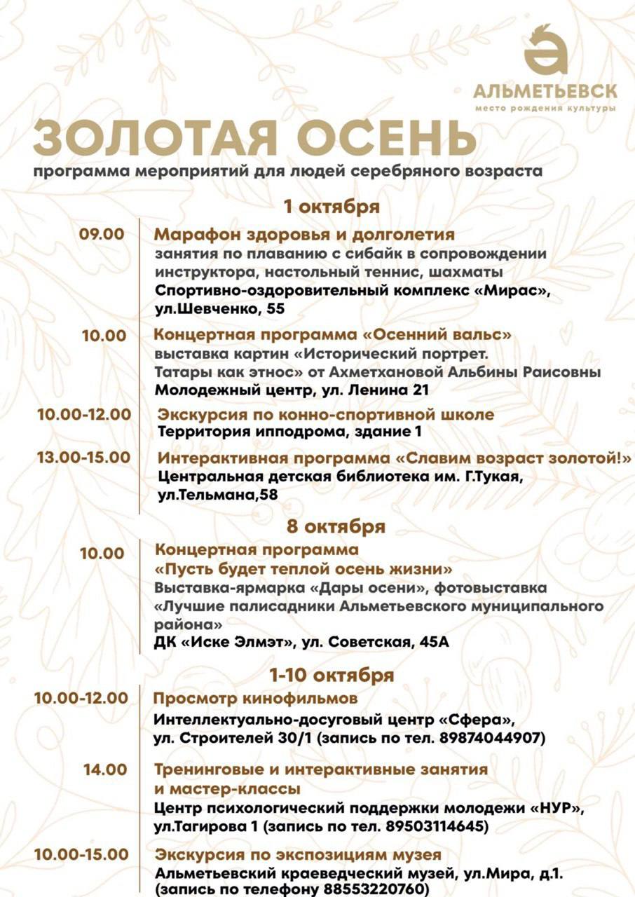 В Молодёжном центре прозвучит концертная программа «Осенний вальс», а также откроется выставка картин Альбины Раисовны Ахметхановой «Исторический портрет. Татары как этнос». В этот же день горожане смогут отправиться на экскурсию в конно-спортивную школу и принять участие в интерактивной программе «Славим возраст золотой!» в Центральной детской библиотеке имени Г. Тукая.